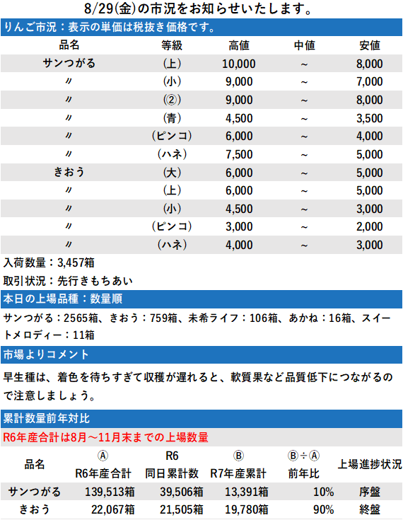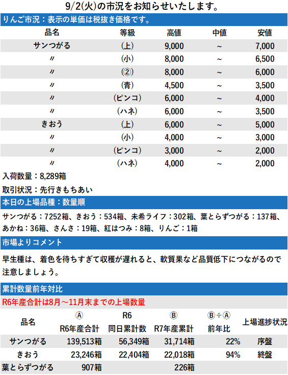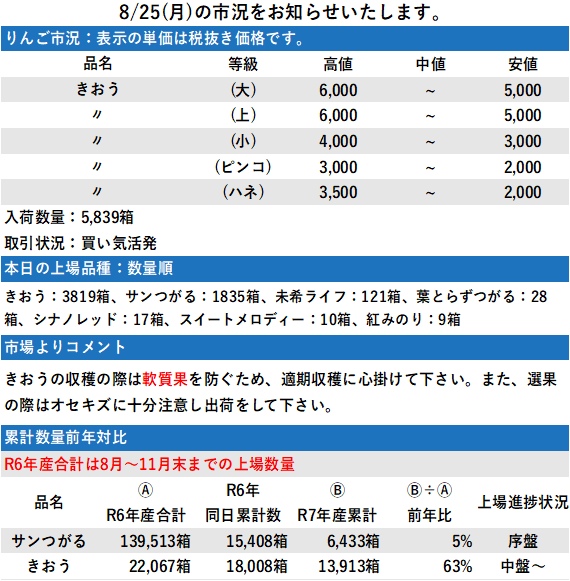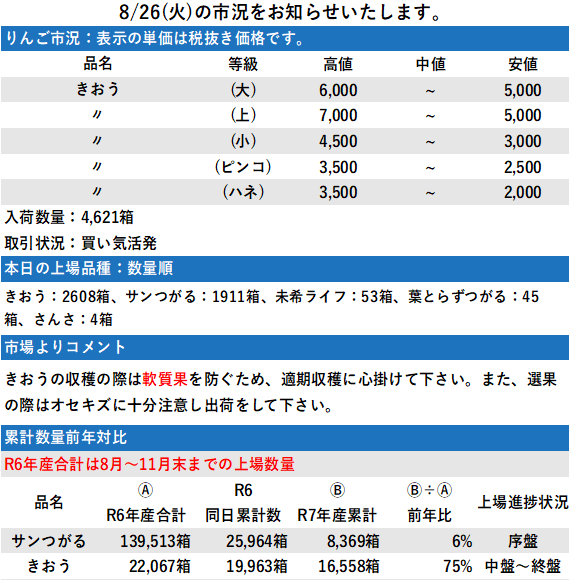 市況とイベント 日程表 日程表 日 月 週 8月 – 9月 2025 8月 – 9月 2025 すべて閉じる すべて開く 8月 21 木 8/21 市況 3,435箱 チケット 8月 21 全日 8月 22 金 8/22 市況 3,477箱 チケット 8月 22 全日 8月 23 土 8/23 市況 5,148箱 チケット 8月 23 全日 8月 25 月 8/25 市況 5,839箱 チケット 8月 25 全日 8月 26 火 8/26 市況 4,621箱 チケット 8月 26 全日 8月 28 木 8/28 市況 4,848箱 チケット 8月 28 全日 8月 29 金 8/29 市況 3,457箱 チケット 8月 29 全日 8月 30 土 8/30 市況 5,126箱 チケット 8月 30 全日 9月 1 月 9/1 市況 8,018箱 チケット 9月 1 全日 9月 2 火 9/2 市況 8,289箱 チケット 9月 2 全日 8月 – 9月 2025 8月 – 9月 2025 登録する Timelyカレンダーに追加 Googleに追加 Outlookに追加 Appleカレンダーに追加 その他のカレンダーに追加 Export to XML